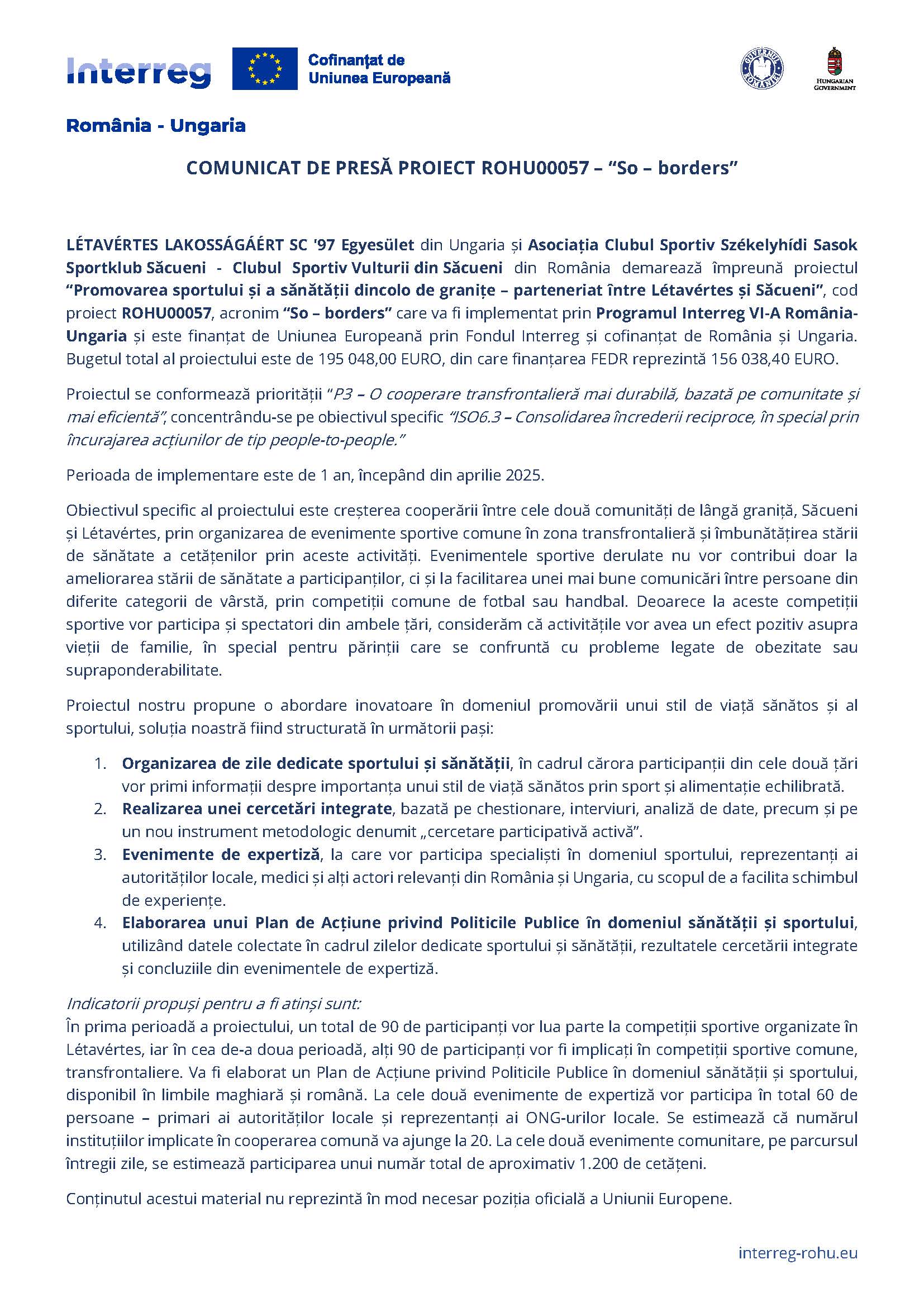 LÉTAVÉRTES LAKOSSÁGÁÉRT SC ’97 Egyesület din Ungaria și Asociația Clubul Sportiv Székelyhídi Sasok Sportklub Săcueni – Clubul Sportiv Vulturii din Săcueni din România demarează împreună proiectul “Promovarea sportului și a sănătății dincolo de granițe – parteneriat între Létavértes și Săcueni”, cod proiect ROHU00057, acronim “So – borders” care va fi implementat prin Programul Interreg VI-A România-Ungaria și este finanțat de Uniunea Europeană prin Fondul Interreg și cofinanțat de România și Ungaria. Bugetul total al proiectului este de 195 048,00 EURO, din care finanțarea FEDR reprezintă 156 038,40 EURO.