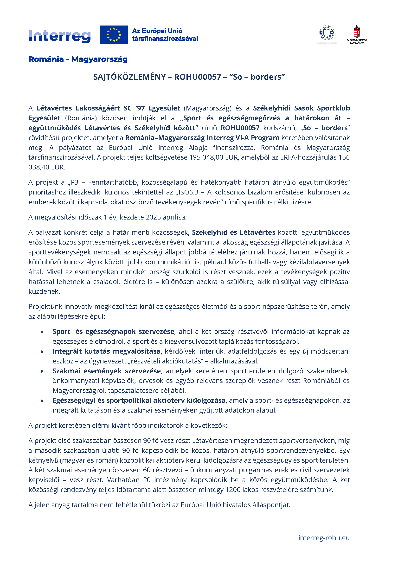 A Létavértes Lakosságáért SC ’97 Egyesület (Magyarország) és a Székelyhídi Sasok Sportklub Egyesület (Románia) közösen indítják el a „Sport és egészségmegőrzés a határokon át – együttműködés Létavértes és Székelyhíd között” című ROHU00057 kódszámú, „So – borders” rövidítésű projektet, amelyet a Románia–Magyarország Interreg VI-A Program keretében valósítanak meg. A pályázatot az Európai Unió Interreg Alapja finanszírozza, Románia és Magyarország társfinanszírozásával. A projekt teljes költségvetése 195 048,00 EUR, amelyből az ERFA-hozzájárulás 156 038,40 EUR.