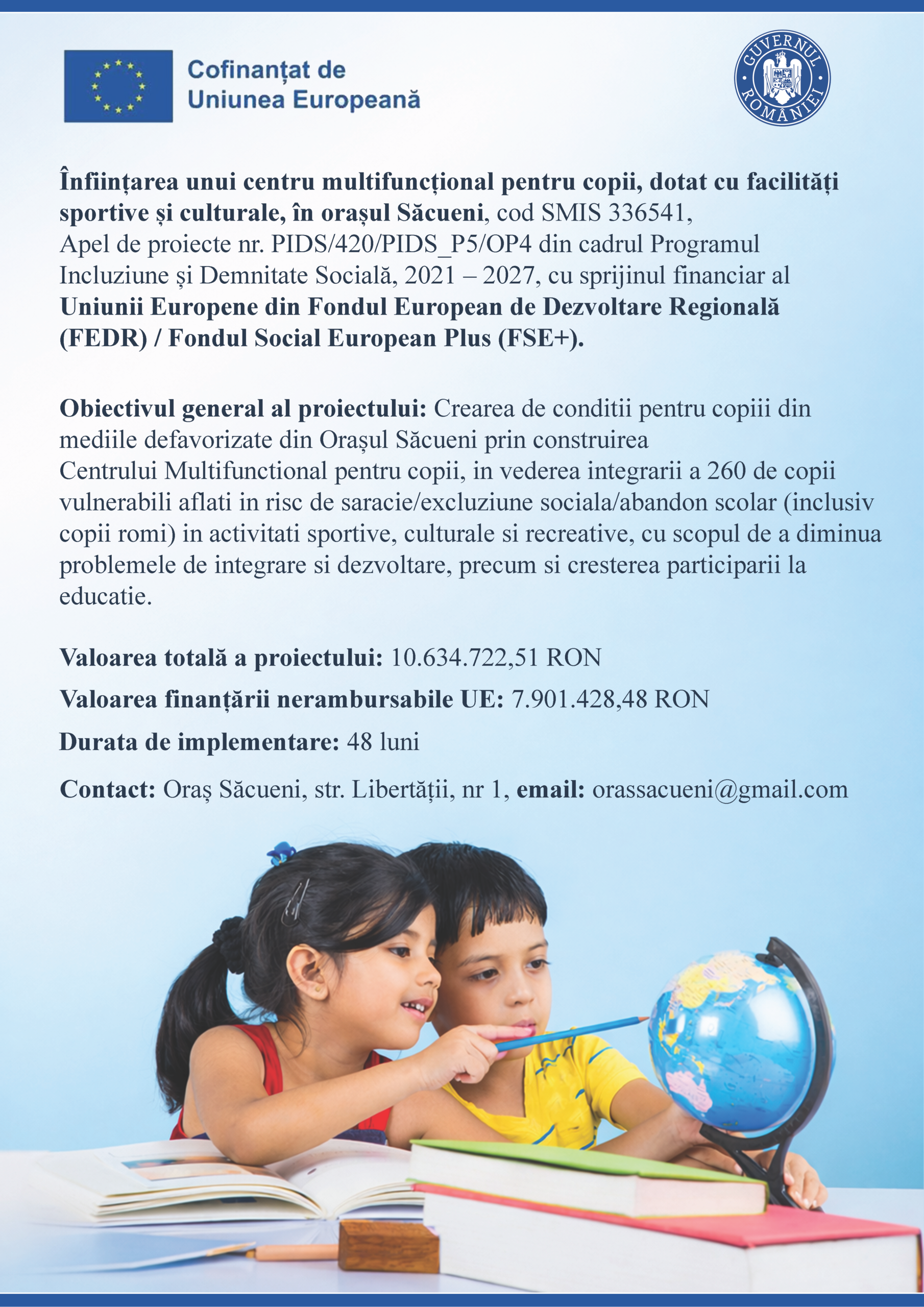 Realizarea centrului multifuncțional pentru copii reprezintă un nou pas important în eforturile orașului Săcueni de a crea un mediu sigur, sprijinitor și plin de oportunități pentru tânăra generație – deoarece viitorul copiilor este și viitorul comunității.