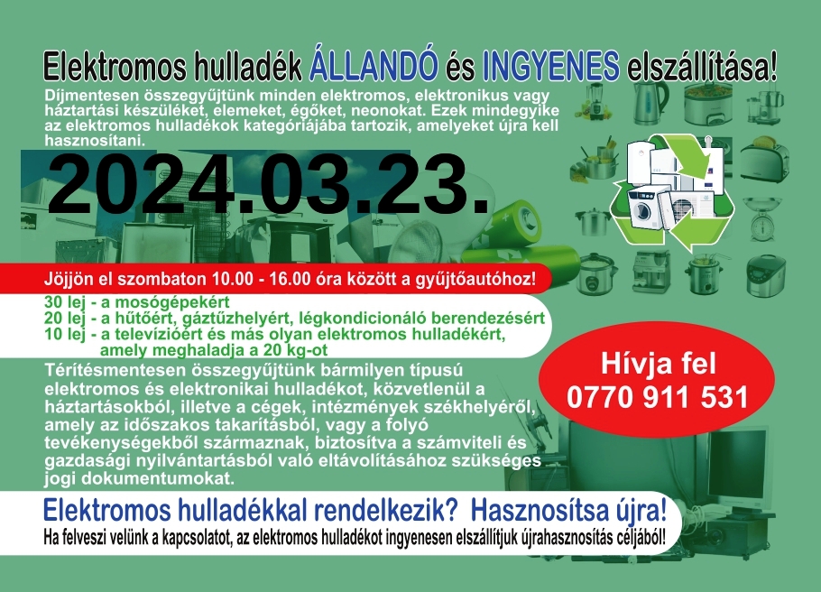 Szombaton, március 23-án elektromos hulladékgyűjtést szerveznek Székelyhídon és a hozzátartozó falvakban! Hívja bizalommal a 0770911531 telefonszámot. Az ECORECNIK SRL cég autói 10-16 óra között bejárják az utcákat és begyüjtik a kihelyezett elromlott, használaton kívüli készülékeket. “A hulladéknak nem a háztartásban van a helye!”