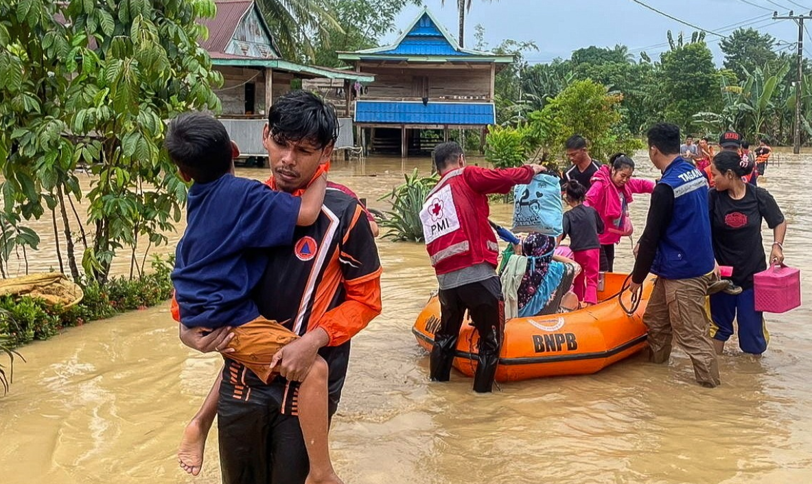A heves esők következtében hatalmas víztömeg zúdult le a Merapi tűzhányó lejtőjén, és hideg lávafolyammá alakulva elárasztotta Tanah Datar és Agam körzeteket – közölte a katasztrófavédelem. A víz még szombat késő éjjel öntötte el a körzetek falvait, több mint száz lakóházat és embereket sodort el magával.
