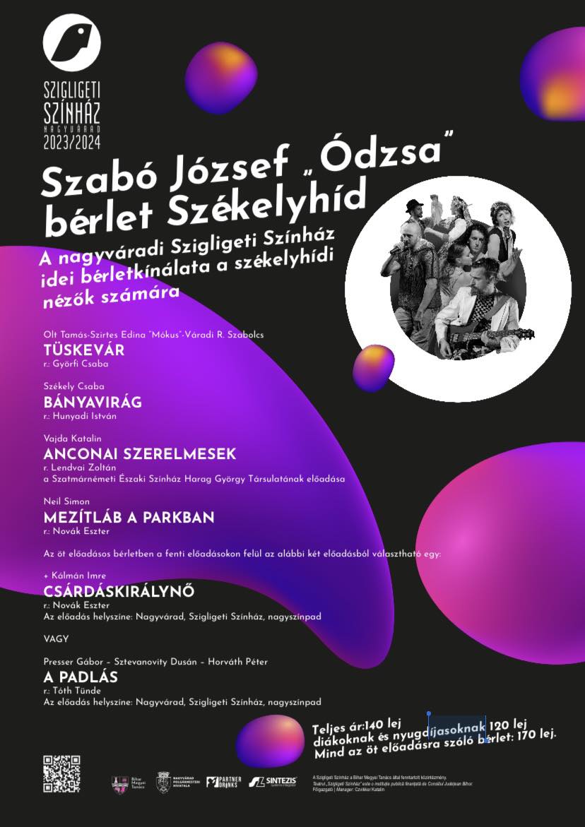 „A Tüskevár, a Bányavirág és a Mezítláb a parkban című saját produkció, illetve a Szatmárnémeti Északi Színház Harag György Társulatának Anconai szerelmesek című előadása érkezik az Érmellék fővárosába ebben az évadban a Szabó József „Ódzsa” bérlet keretében. A székelyhídi bérletvásárlók emellett a Csárdáskirálynő vagy A padlás című zenés előadásainkat is megnézhetik a Szigligeti Színházban.”- hangzott a sajtótájékoztatón.