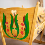 A hársfából készült bölcsők festéséhez ezúttal is kizárólag természetes eredetű, az egészséget nem károsító színezőanyagokat használtak. A bölcsők díszítései ősidőkre visszanyúlva megidézik a Kárpát-medencében található régi magyar templomok mennyezetkazettáinak szín- és formavilágát, úgy, hogy a motívumok jelentéstartalma a születés, az anyaság vállalása, az élet továbbadásának fontossága, az élet ismétlődő újrateremtése, az örök megújulás üzenetét is magukban hordozzák.